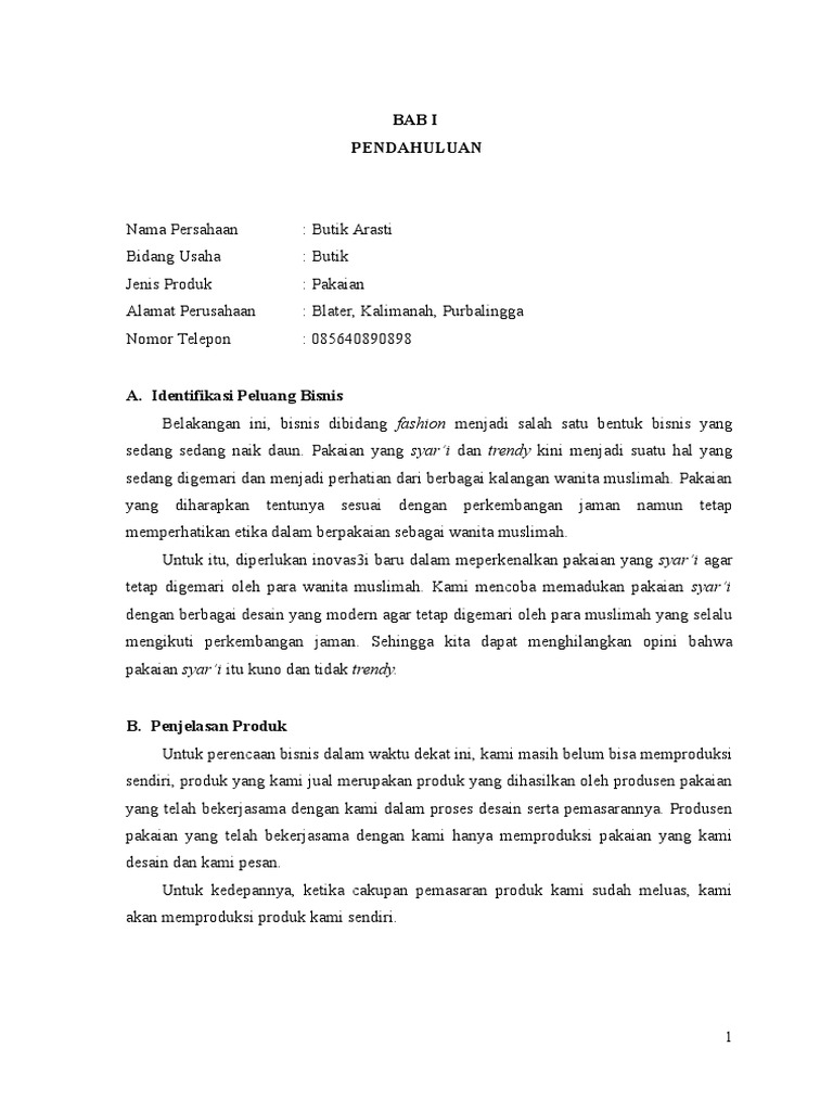 Termasuk juga masyarakat ponorogo, jawa timur yang juga tak kalah tertarik untuk mengikuti tren produk fashion pakaian yang terkini. Chitra dini letari (1605015080) d3 perbankan syariah universitas islam negeri walisongo semarang tahun akademik 2017/2018 i ii kata pengantar puji syukur atas kehadirat tuhan yang maha esa. Proposal dalam bisnis bertujuan untuk memetakan atau menjabarkan dengan jelas tentang konsep bisnis yang akan dilakukan kepada atasan maupun pihak terkait dalam suatu negosiasi untuk mendapatkan suatu kesepakatan bersama.