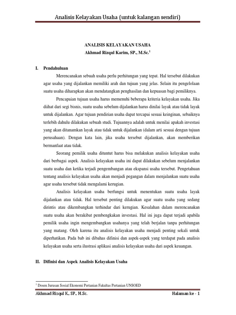 Analisis kelayakan bisnis. Studi kelayakan bisnis untuk wirausaha lilis sulastri, dr., mm. Studi kelayakan bisnis adalah suatu kegiatan yang mempelajari secara mendalam tentang suatu usaha atau bisnis yang akan dijalankan, dalam rangka menentukan layak atau tidak usaha tersebut dijalankan (kasmir dan jakfar 2012:7). Adapun tujuan melakukan analisis pada aspek hukum ini adalah meneliti keabsahan, keaslian, dan kesempurnaan dokumen yang ada atau yang dimiliki.